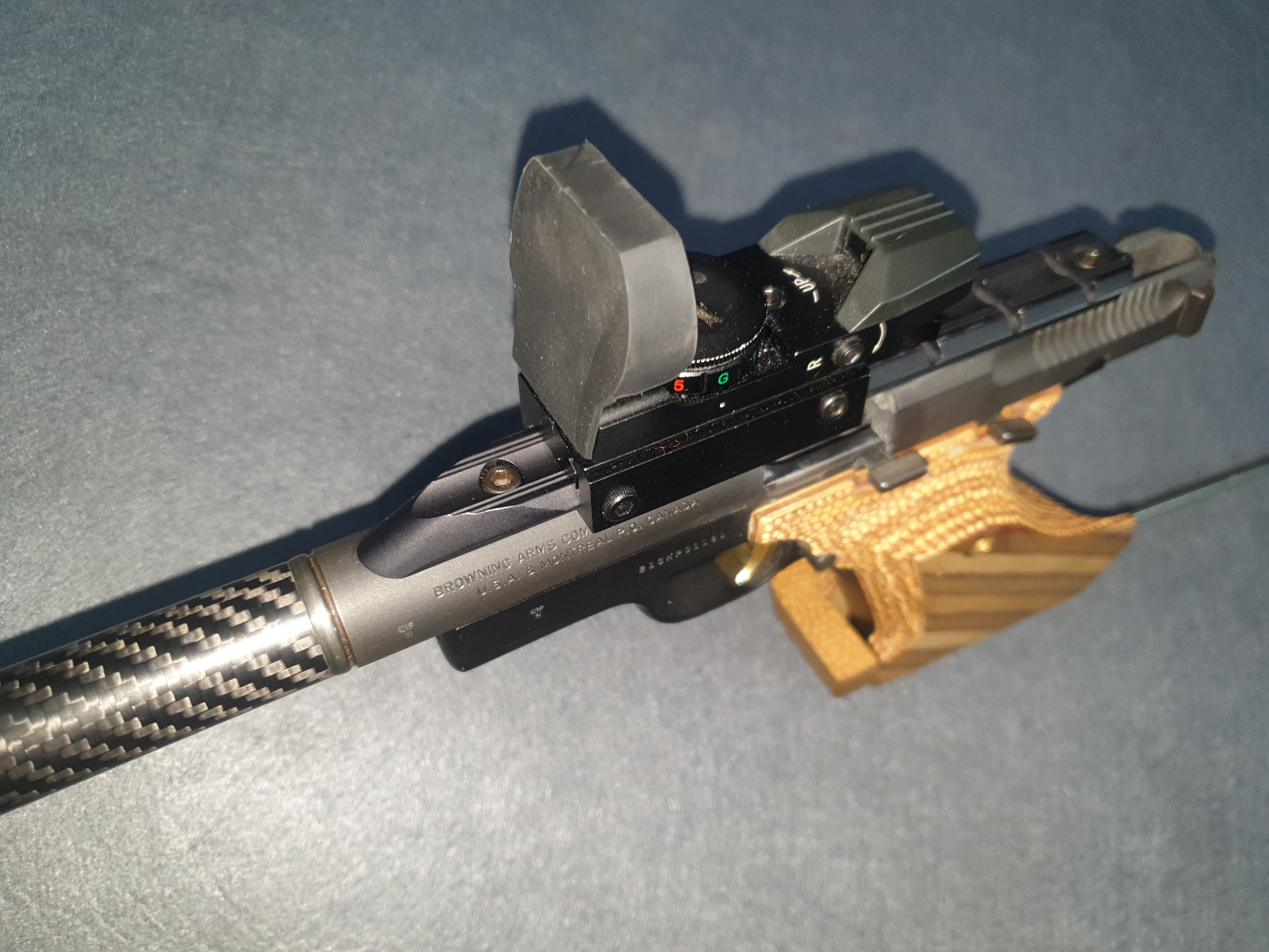 Barrel lightened, carbon shroud added. Trigger lightened. 1/2" UNF thread. Reproofed.